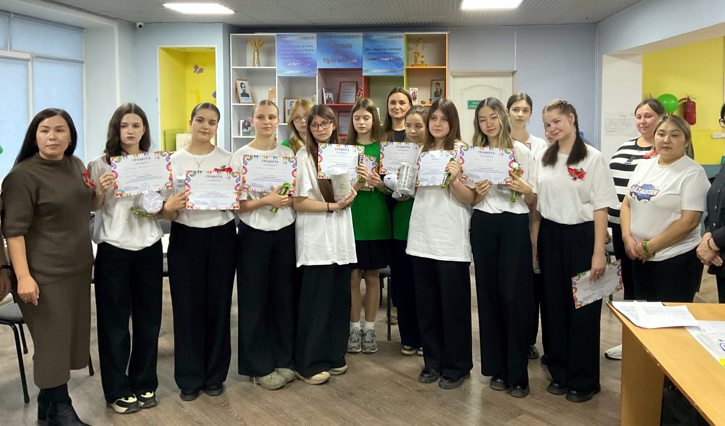 Помимо обучающей части, участникам предложили проявить творческий подход. Провели конкурс рисунков, в котором первое место заняла школьница Камила Багытова. Она рассказала, что об участии узнала от классного руководителя. Вместе с подругой они создали рисунок, символически изобразив две руки, сердце и шприц – как напоминание о хрупкости человеческой жизни и необходимости защиты. На мероприятие Камила пришла не одна – вместе с ней участвовали ещё три ученицы из параллельного класса. Все они соревновались одной командой в викторине, которая стала для школьников не только испытанием знаний, но и шансом проявить внимание и солидарность.