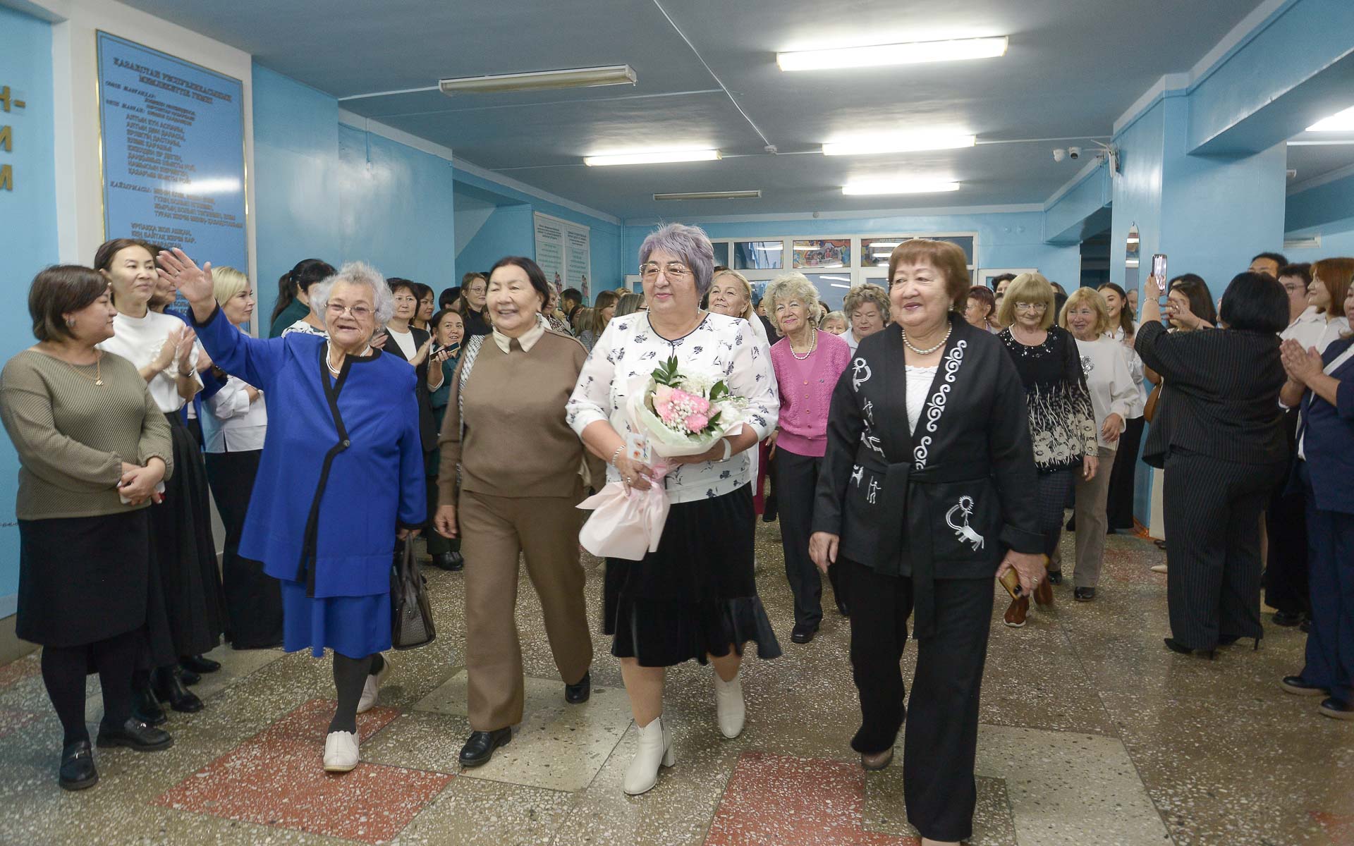 Затем для ветеранов был устроен своеобразный почётный проход по «живому коридору»: школьники выстроились вдоль коридоров, приветствуя бывших педагогов аплодисментами и словами благодарности. Ветераны во главе с директором школы прошли к актовому залу, где их ожидала торжественная часть.